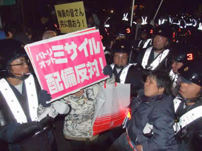 ■「11月29日未明にPAC3配備!」の情報が、「パトリオットミサイルはいらない!習志野基地行動実行委員会」を中心とする反対運動のネットワークに流されました。PAC3は愛知県小牧の三菱重工業で製造され、そこから運搬されます。前夜10時頃から80名ほどの人々が習志野駐屯地に集まりました。