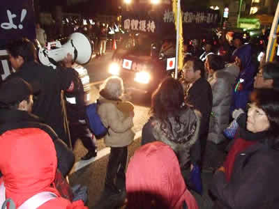 ■午前3時すぎ、パトリオットの台車になる大型トレーラー5台が、地響きをたてて正門前に近づくと、人々は口々に「パトリオット配備やめろ」「強行搬入を阻止するぞ!」「機動隊は帰れ!」などの激しいシュプレヒコールをたたきつけ、抗議行動をやり抜きました。