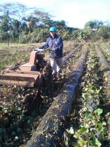 最初に蔓(つる)刈り機で、サッマイモの蔓を刈り飛ばし、刈り残った蔓を鎌で一本々切り離して行きます。
