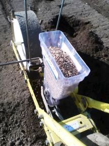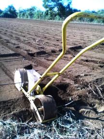 種まき機に麦の種を入れ、手で押しながら播いていきます