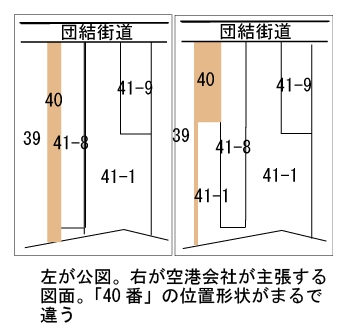 ■地籍測量図と同様、ここでも伝聞資料でしかなく、「公図がなぜ間違っているのか」「地籍測量図の方がなぜ正しいのか」を証明する資料とはなっていません。旧土地台帳法に基づく地図である公図は、面積はともかく、形状や方向に関しては信頼できるというのが法律界の定説であり、判例も支持し確定しています。会社側が公図と違う図面を「正しい」と主張するのなら、第3者が確証できない伝聞ではなく、客観証拠をもって「自分の図面の方が正しい」ことを証明しなければならないのです。空港会社側はその証明をできないということです。