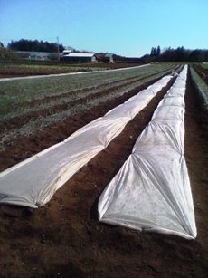 ※玉葱の補植が済んだ所から順次寒冷遮をかぶせて行きます。(北風と霜から苗を守るための布です)