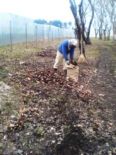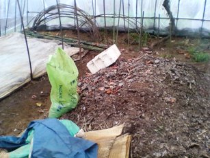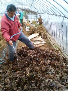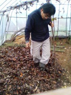 木曜、午前中、冷たい雨が降る中、明日の出荷物を取り終え、午後からポット植え用の(床土)作りに入りました!材料は落葉樹の落葉が9割、稲ワラが1割で作ります。森(東峰の森)から集めた落葉(ヌカ袋にギュギュに詰めて30袋、約600k)に水を散水しながら踏み固めて、乾燥を防ぐためにビニールを掛けます。その落葉を挟む様に稲ワラを乗せ発酵を促進させるために米ぬかを混ぜ込みました。