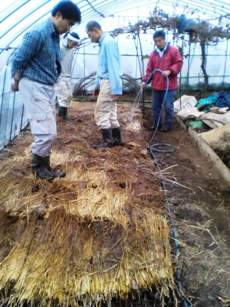 寒さを防ぐため芋の上にすくも(もみがら)をかけているところ