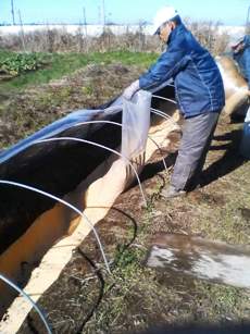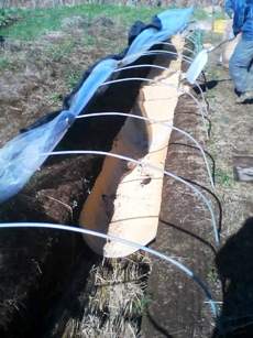 ※霜や雨水で芋が痛むのを防ぐためにビニールを掛けた芋穴の上に土を15cm程かけて芋を守ります。