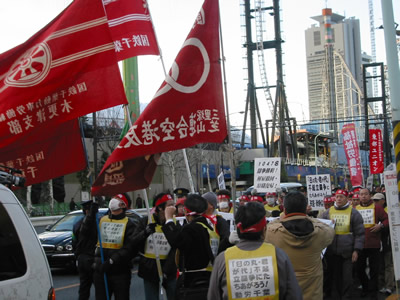 ■三里塚も、43年目の闘いを迎えますが、その底流は、労農連帯です。今、市東さんへの農地強奪攻撃が切迫しています。土地収用法が失効したため、農地法で農地を収用するというとんでもない攻撃です。みなさん、本日は1047名解雇撤回、08春闘勝利の闘いを断固たたかいとり、労働者・農民・全人民の団結で戦争をとめる3・16全世界一斉デモにともに全力で決起しようではありませんか。3・16イラク反戦闘争から3・30三里塚現地3000人結集へ総決起を訴えてあいさつとします」