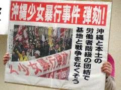 12万人が集まった昨年の9・29沖縄県民大会の沖縄戦「軍命削除」の教科書検定意見に対する撤回要求は、この少女暴行事件・米軍の存在への怒りと一体だ。米軍基地撤去の要求と一体だ。さらに「日の丸・君が代」強制と闘う教育労働者の闘いと一体だ。怒りと闘いは今、激しく前進している。団結の力で闘おう! ただちに、アメリカ政府・アメリカ大使館・日本政府・防衛省へめ抗議に決起しょう!労働者は国境を越え一つ、イラク反戦3・16全世界一斉デモ(代々木公園)に結集しよう!