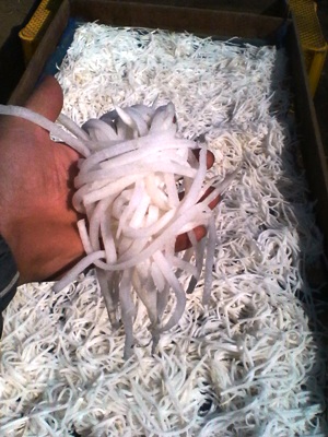 火曜、野菜の出荷作業。品目大根、人参、ネギ、ゴボウで新しくヤーコンが入りました。ヤーコンは12月6日に掘り取り、貯蔵して在ったもので、掘り取り直後より甘味がグッと増しています。サラダ、天ぷら、炒め物など何にでも良く合いますが、特にお勧めは千切りやサイコロ状に切ってキムチと合える食べ方です。