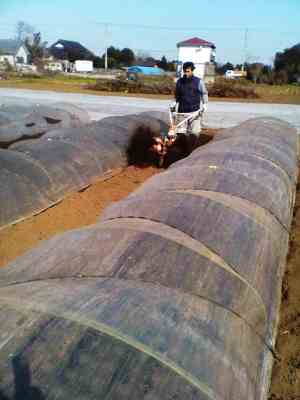 保温ビニールをかぶせた後は、風で飛ばされないように裾に土をかけていきます