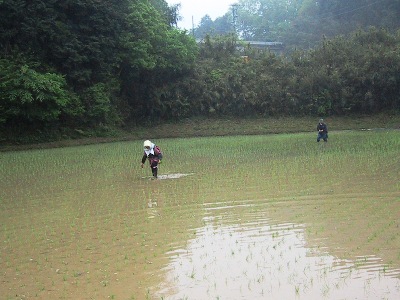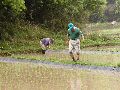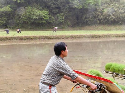 ■5月4日、萩原進さんと市東孝雄さん宅で同時に田植えが行われました。どちらの田んぼも「日航ホテル」の北側に位置していて、実は300メートルぐらいしか離れていません。