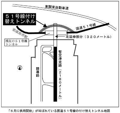■さる5月20日を前後して、成田空港の暫定開港30周年キャンペーンが展開され、それは現在も続いています。「成田は満杯」「需要増に応えられない」「羽田に負ける」だから「年間30万回への飛行回数増を実現しよう」等々身勝手でデタラメな宣伝がくり広げられています。そして、国道51号線の付け替えトンネル供用開始が声高に叫ばれています。(地図参照)