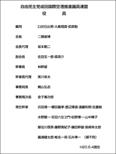 ■この「議員連盟」の実態は、千葉県選出の国会議員が成田利権の保持を求めて、羽田への航空需要の移行に歯止めをかける、との私利私欲に基づくものです。同じ思惑で、堂本暁子・千葉県知事は「成田空港の応援団ができたことは、うれしいこと」と歓迎し、小泉一成成田市長は「成田空港の応援団ができたことを心強く受け止めている」と話しています。