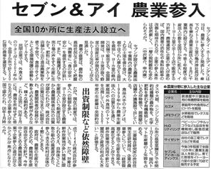 「セブン&アイ」(セブンイレブンとイトーヨーカ堂)の農業への参入を報じる新聞(6月20日付読売新聞)。骨太方針2008は、この方向を推し進めるものです。