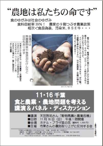 ■11月16日千葉市内で「市東さんの農地取り上げに反対する会」が主催するイベントが行われます。「食と農業・農地問題を考える11・16講演&パネルディスカッション」と題し、市東さんの農地裁判の背後にある農業切り捨てと食の危機の問題を、世界的な視点から考えようという意欲的な企画です。