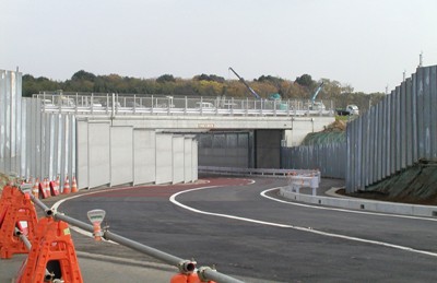 ■11月17日、NAAと千葉県は、天神峰・東峰の生活道路(旧小見川県道)の切り替えを強行した。新誘導路工事と交差するため、トンネル化し、その下にルートを変えたのだ。写真でも分かるようにトンネル前後でカーブしているため、交通事故は必至だ。さらに、トンネルの上を我が物顔で新誘導路工事を行なっている。