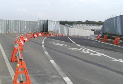 切り替えられた道路(トンネル)の上では、新誘導路工事がこれ見よがしに強行されている