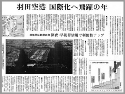 ■羽田空港の第4滑走路が2010年10月に開業する、と宣伝されています。経団連などの経済団体、東京都や神奈川県などの地元自治体は、羽田の国際線枠拡大を求めて激しい運動を進めており、国土交通省も容認する姿勢です。こうした動きを反映して、写真にあるように1月4日の産経新聞が大々的に羽田国際線化推進のキャンペーンをはりました。
