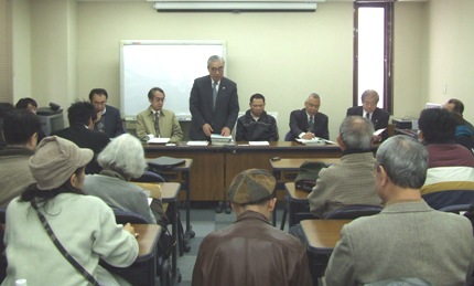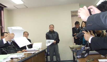■続いて、葉山岳夫弁護士をはじめ弁護団から裁判の説明がなされました。記者や傍聴に駆けつけた人々からは、法廷で争点になった藤崎メモ(空港会社が自らの主張を裏付けようとして出したもの旧地主の藤崎政吉が勝手に書いた手書きのメモで、逆に信憑性を損なうようなもの)や裁決申請書の記載について質疑が出され、空港会社の主張がいかに根拠のないものか、明らかになりました。