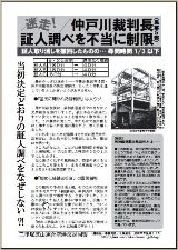 ■私たちのまっとうな批判にぐらつき、また、あまりのデタラメさゆえに、仲戸川裁判長は証人取り消しを撤回しました。ところが今度は、これまた自ら決定していた尋問時間を、3分の1以下に大幅短縮してきたのです。法に基づくべき裁判長が、自分の勝手でころころと態度を変えていては、およそ裁判など成り立ちません。