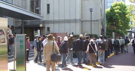 傍聴券抽選の整理券配布に並ぶ皆さん