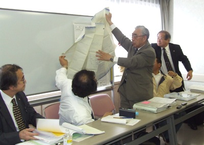 記者会見で図面を使って説明する弁護団