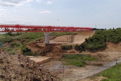■現在、暫定滑走路北側では、東関東自動車道をまたいで、約900メートルものハシゴ状の鉄橋をかけ、そこに進入灯を設置する工事が急ピッチで行われています。写真(下)にもあるように空港警備隊のワゴン車が警備ではりついています。この進入灯工事も暫定滑走路の危険の増幅につながるとんでもない行為です。