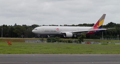 東峰の森前を自走するアシアナ航空機。手前に見える樹木は東峰神社の神社林。この木々も進入表面を突き破っている。