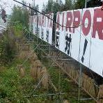 この看板は、暫定滑走路開港に対する反撃として「DOWN WITH NARITA AIRPORT(成田空港粉砕)」「成田空港絶対反対」と英語および日本語で描かれたもので、2002年4月17日に建設しました。