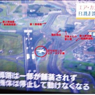 エア・カナダ機が立ち往生したのは1枚目(午後8時頃の画像)と2枚目の写真からわかるように、市東さんの家や畑の目の前です。建設中の誘導路は、完成したとしても市東さん宅の目の前につながるだけ。何の使いようもありません。使えるとすれば、市東さんを追い出して更地にし、誘導路をさらに延ばしたときだけです。つまりは、そういう脅し以外の何物でもないということです。