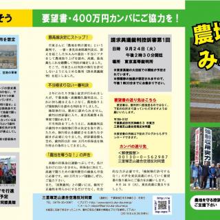 控訴審闘争へ新たなリーフレットを作成 請求異議裁判の控訴審は、9月24日午後2時30分から東京高裁の大法廷で第1回が開かれることになりましたが、農地取り上げ強制執行阻止に向けて闘いを広げるべく、新しいリーフレットを作成しました。 反対同盟がこの間訴えていることをトータルかつコンパクトにまとめた巻き三つ折り6Pのリーフレットです。 画像ファイルで掲載しますのでご覧下さい。 トラックバック(0) トラックバックURL